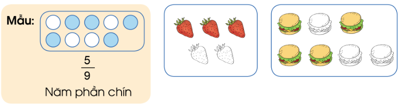 a) Nêu rồi đọc phân số chỉ số phần đã tô màu trong mỗi hình dưới đây (theo mẫu):