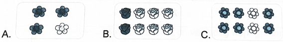 Khoanh vào chữ đặt trước hình đã tô màu $frac{3}{4}$ số bông hoa của hình đó.