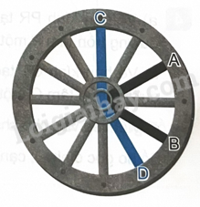 Có một bánh xe bằng gỗ đã hỏng (như hình bên). Con mọt gỗ đang gặm một trong hai cái nan xe A hoặc B. Biết nan xe đó và một trong hai nan xe C hoặc D tạo thành một góc tù. Nan xe mà con mọt gỗ đang gặm là: