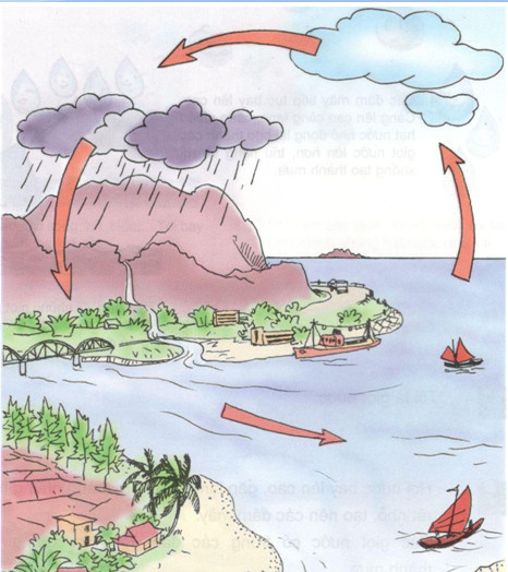 Chỉ vào sơ đồ và nói về sự bay hơi, ngưng tụ của nước trong tự nhiên.