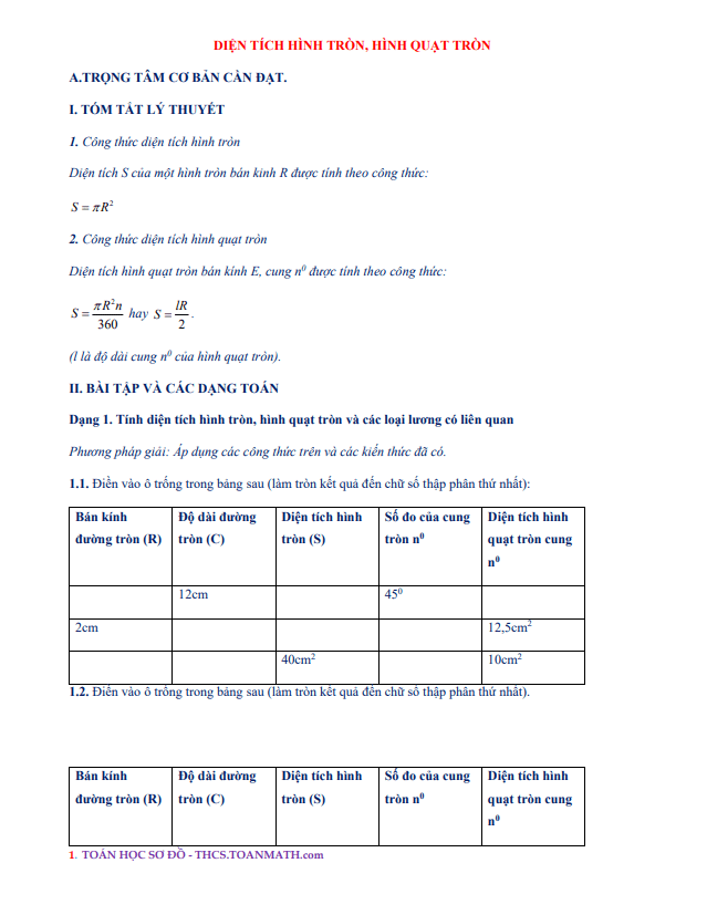 Tài liệu này cung cấp cách giải chi tiết, từ cơ bản đến nâng cao, giúp học sinh hiểu rõ hơn về diện tích hình tròn và hình quạt tròn, từ đó có thể áp dụng linh hoạt vào việc giải các bài tập và bài toán liên quan.