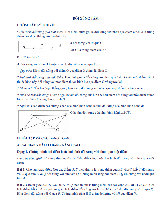 - Dạng 1: Chứng minh hai điểm hoặc hai hình đối xứng với nhau qua một điểm. Phương pháp giải: Sử dụng định nghĩa hai điểm đối xứng hoặc hai hình đối xứng với nhau qua một điểm.