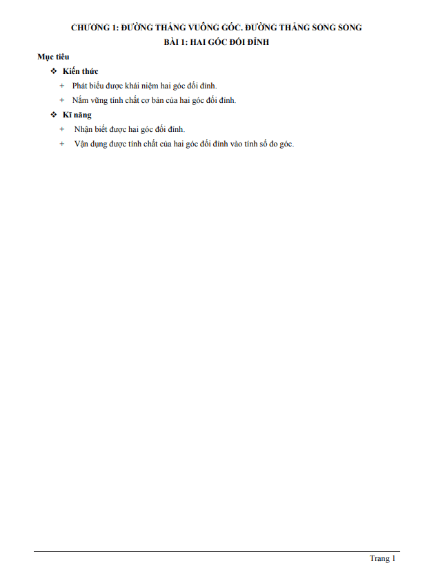 Tài liệu này gồm 09 trang, cung cấp kiến thức về hai góc đối đỉnh, từ lý thuyết đến các dạng toán và bài tập thực hành. Được thiết kế để hỗ trợ học sinh lớp 7 trong quá trình học tập môn Toán, đặc biệt là phần Hình học chương 1 với tiêu chí mục tiêu sau: