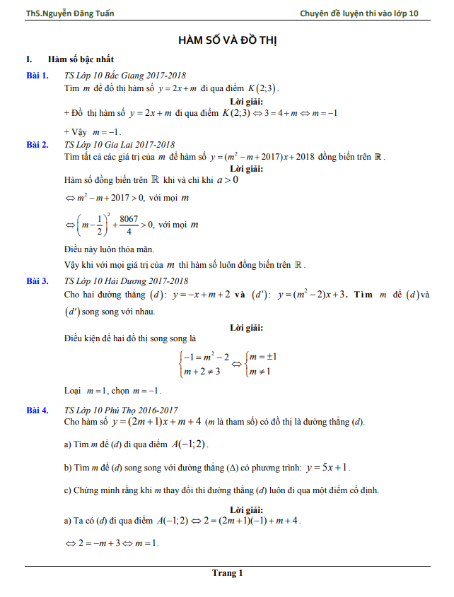 Chuyên Đề Hàm Số Và Đồ Thị Ôn Thi Toán Lớp 10 – Nguyễn Đăng Tuấn