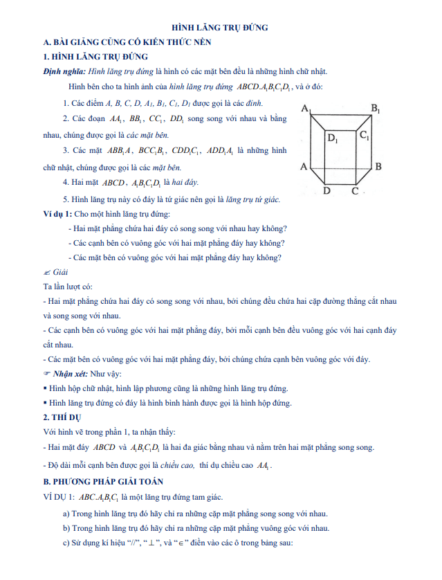 Phần bài giảng trong tài liệu giúp củng cố kiến thức về hình lăng trụ đứng thông qua ví dụ minh họa. Ngoài ra, phần phương pháp giải toán giúp học sinh hiểu rõ hơn cách tiếp cận và giải quyết các bài toán liên quan đến chủ đề này. Cuối cùng, phiếu bài tự luyện là công cụ hữu ích giúp học sinh ôn tập và kiểm tra kiến thức của mình.