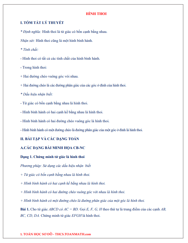 Dạng 1. Chứng minh tứ giác là hình thoi bằng cách sử dụng các dấu hiệu nhận biết. Ví dụ như tứ giác có bốn cạnh bằng nhau là hình thoi.