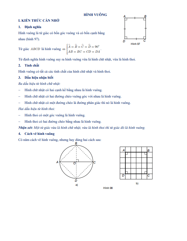 Trong tài liệu này, người đọc sẽ được hướng dẫn cách nhận dạng hình vuông và cách giải các bài tập liên quan. Đồng thời, tài liệu cũng cung cấp phương pháp để chứng minh các quan hệ bằng nhau, song song, vuông góc, và thẳng hàng trong hình vuông.