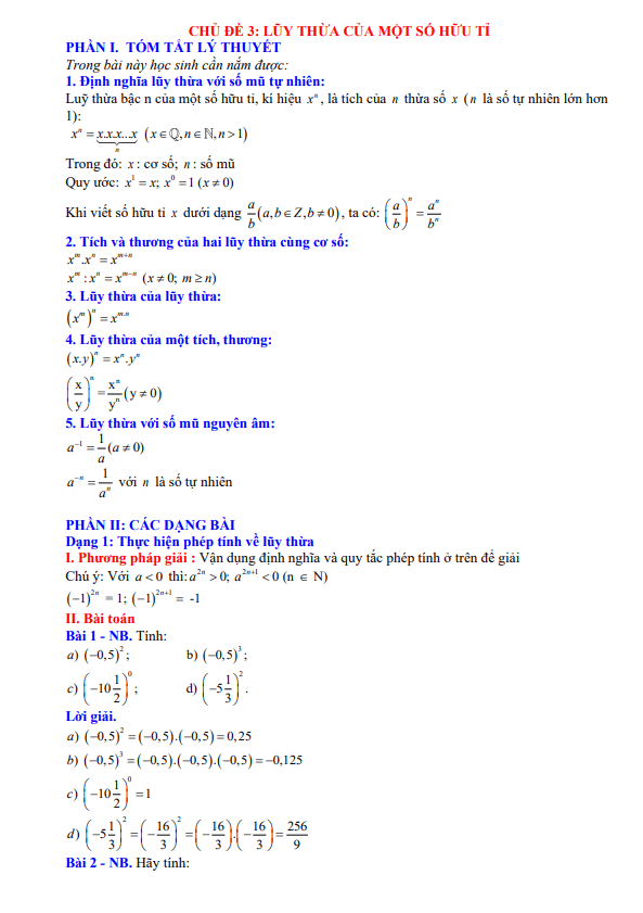 Để giúp học sinh lớp 7 hiểu rõ hơn về chuyên đề lũy thừa của một số hữu tỉ, tài liệu này bao gồm 29 trang tóm tắt lí thuyết và hướng dẫn giải các dạng bài tập phổ biến.