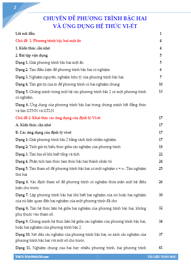 Chuyên đề phương trình bậc hai và ứng dụng hệ thức Vi-ét