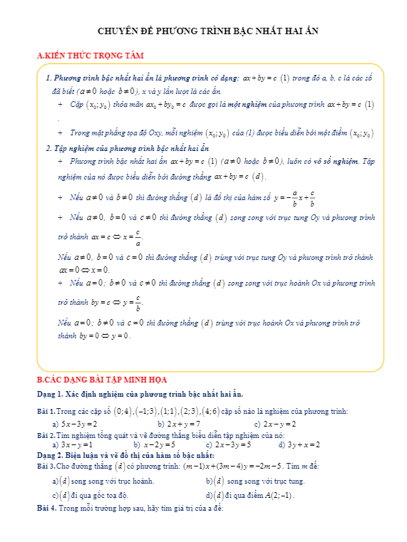 Đầu tiên, “Chuyên đề phương trình bậc nhất hai ẩn” là một tài liệu học tập quan trọng với 19 trang, được biên soạn bởi tác giả Toán Học Sơ Đồ. Tài liệu này tổng hợp kiến thức quan trọng và cung cấp hướng dẫn chi tiết về cách giải các dạng bài tập tự luận và trắc nghiệm trong chuyên đề phương trình bậc nhất hai ẩn.Trước hết, tài liệu bao gồm các kiến thức cơ bản như phương trình bậc nhất hai ẩn và tập nghiệm của chúng. Sau đó, tài liệu tập trung vào các dạng bài tập minh họa, bao gồm các dạng như xác định nghiệm của phương trình bậc nhất hai ẩn, biện luận và vẽ đồ thị của hàm số bậc nhất, cũng như tìm nghiệm nguyên của phương trình.Ngoài ra, tài liệu cũng cung cấp các bài tập trắc nghiệm rèn luyện và tự luyện để học sinh có thể ôn tập và kiểm tra kiến thức của mình. Tài liệu này hỗ trợ học sinh trong quá trình học tập chương trình Đại số 9, đặc biệt trong chương 3 với bài số 1 về phương trình bậc nhất hai ẩn.Tóm lại, “Chuyên đề phương trình bậc nhất hai ẩn” là một tài liệu hữu ích, cung cấp kiến thức chi tiết và hướng dẫn cụ thể giúp học sinh nắm vững và áp dụng phương trình bậc nhất hai ẩn trong bài tập và bài kiểm tra.