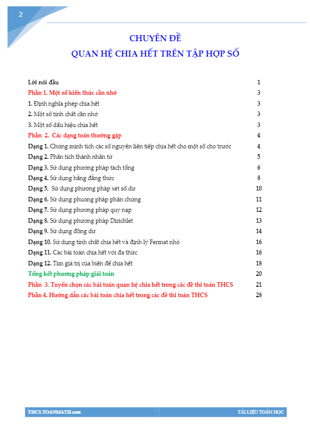 • Dạng Toán lớp 4-12: Sử dụng các phương pháp khác nhau như quy nạp, nguyên lý Dirichlet, đồng dư, định lý Fermat nhỏ để giải các bài toán quan hệ chia hết trên tập hợp số.