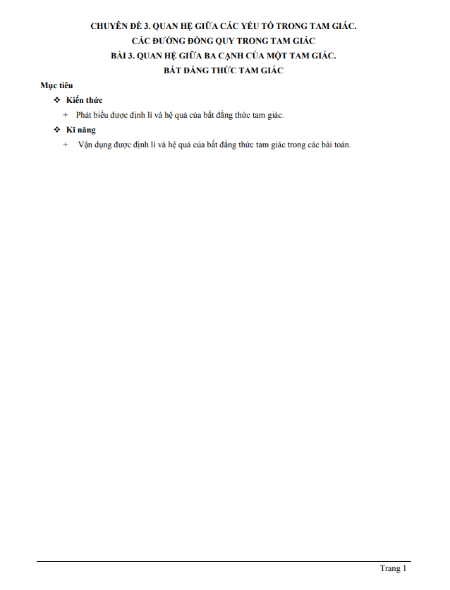 - Kỹ năng: Vận dụng được định lí và hệ quả của bất đẳng thức tam giác trong các bài toán.