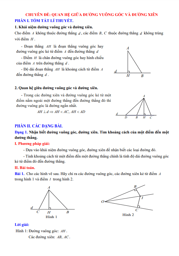 Dạng 1: Nhận biết đường vuông góc, đường xiên và tính khoảng cách từ một điểm đến một đường thẳng.