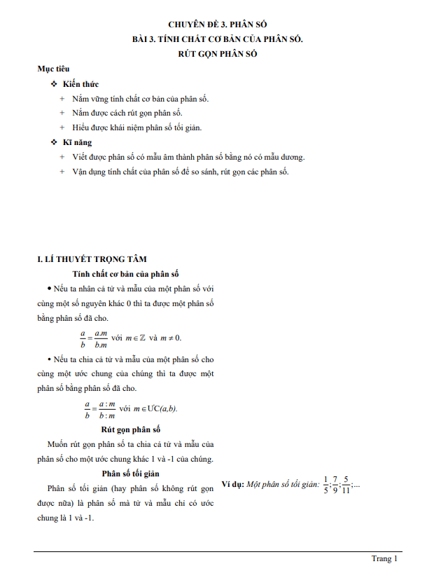 Chuyên đề tính chất cơ bản của phân số, rút gọn phân số
