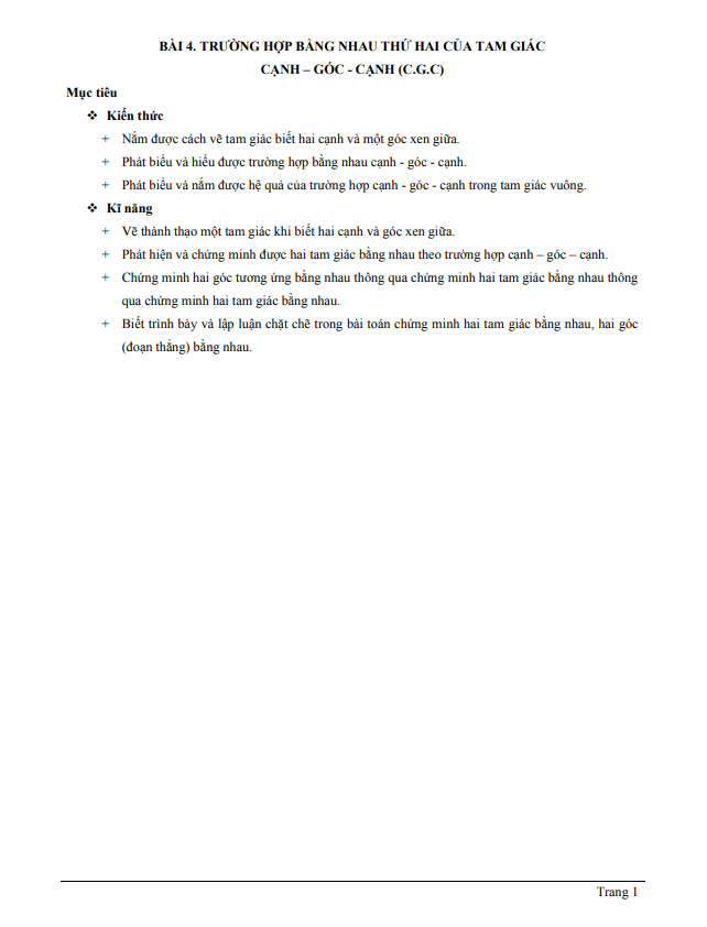 - Hiểu và áp dụng trường hợp bằng nhau cạnh – góc – cạnh.