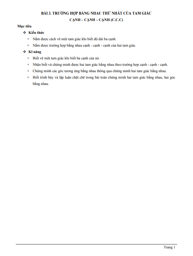 - Nhận biết và chứng minh được hai tam giác bằng nhau theo trường hợp cạnh – cạnh – cạnh.