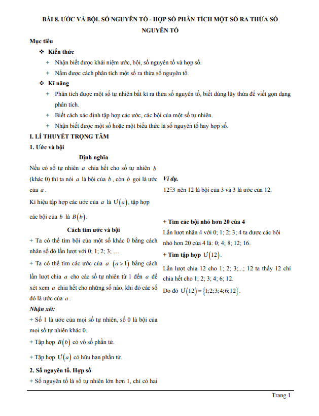 I. Lí thuyết trọng tâm: Cung cấp những kiến thức cơ bản về ước và bội, số nguyên tố và hợp số, cũng như cách phân tích một số ra thừa số nguyên tố.