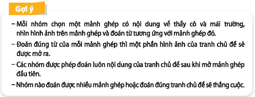 Học sinh tự thực hiện trò chơi. Vận dụng kiến thức giải hoạt động 1 Câu 1 trang 26 Tuần 9, Chủ đề 3: Kính yêu thầy cô – thân thiện với bạn bè sách Hoạt động trải nghiệm 3 – Chân trời sáng tạo.