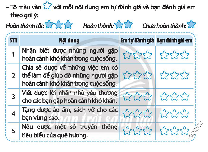 – Em đọc nội dung của bảng đánh giá, thông qua những lần tham gia hoạt động, em thấy mình đã hoàn thành tốt những yêu cầu của bảng đưa ra chưa? Tự mình đánh giá mức độ hoàn thành của bản thân.