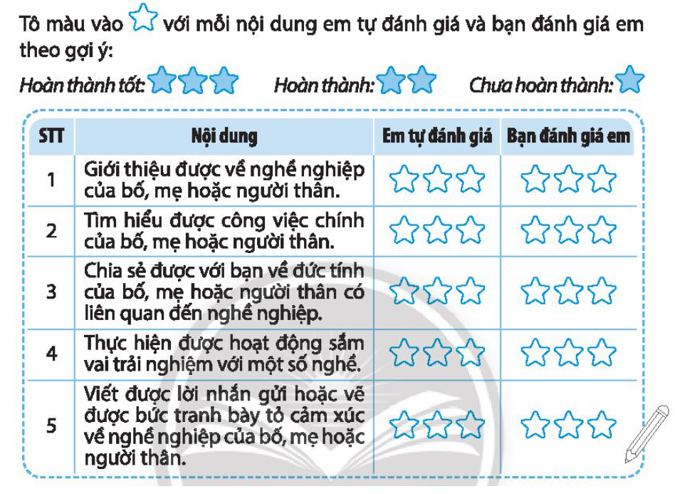 – Sau đó, em nhờ bạn đánh giá thông qua những ghi chép của em trong vở bài tập và tô màu vào bảng.