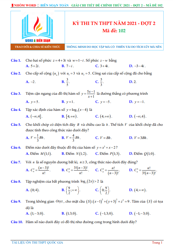 Đề thi tốt nghiệp THPT 2021 môn Toán đợt 2 đã diễn ra vào chiều thứ Sáu ngày 06 tháng 08 năm 2021. Trong đó, nhóm Word Và Biên Soạn Tài Liệu Toán đã biên soạn tài liệu đáp án và lời giải chi tiết để thầy cô và các em học sinh tham khảo.