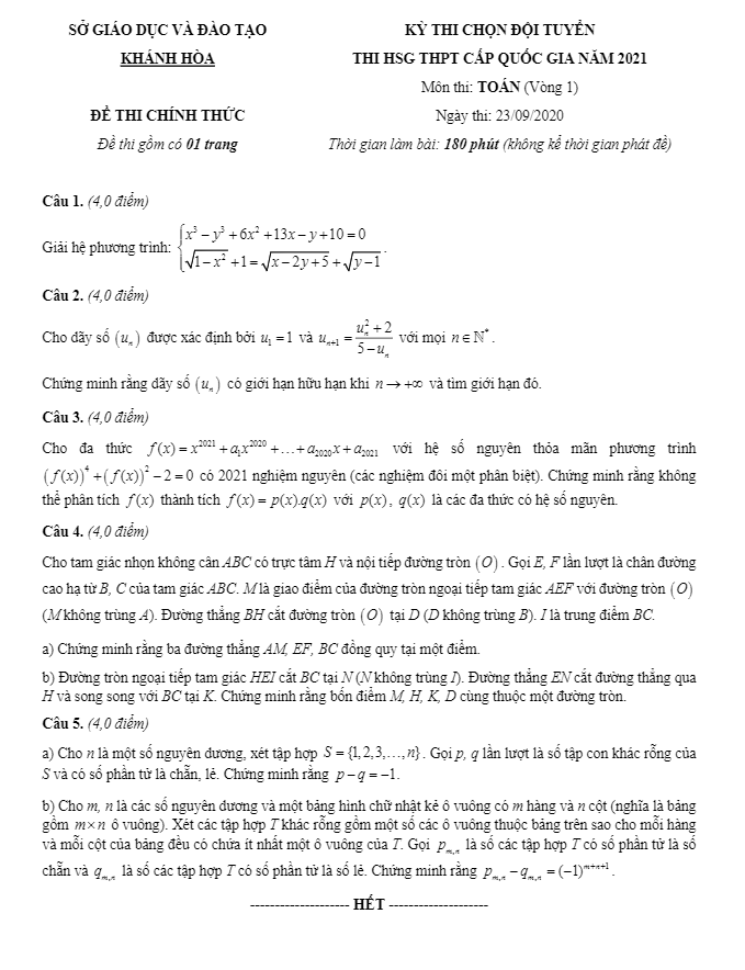 Ngày 23 tháng 09 năm 2020, sở Giáo dục và Đào tạo tỉnh Khánh Hòa đã tổ chức kỳ thi chọn đội tuyển học sinh giỏi THPT cấp Quốc gia năm 2021 môn Toán (vòng 1).
