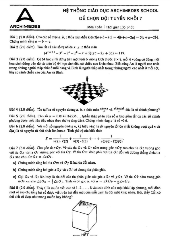 Xin chào quý thầy cô và các em học sinh lớp 7! Đây là đề thi chọn đội tuyển học sinh giỏi môn Toán lớp 7 năm học 2022 – 2023 của hệ thống giáo dục Archimedes School, thành phố Hà Nội. Đề thi bao gồm 01 trang với 07 bài toán dạng tự luận, thời gian làm bài thi là 135 phút.