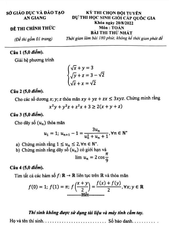 Sytu xin gửi đến quý thầy, cô giáo và các em học sinh đề thi chọn đội tuyển dự thi học sinh giỏi cấp Quốc gia môn Toán năm học 2022 – 2023 sở Giáo dục và Đào tạo tỉnh An Giang. Kỳ thi sẽ được tổ chức vào ngày 20 tháng 08 năm 2022. Chúc các em học sinh sẽ đạt kết quả cao và có thành tích xuất sắc trong kỳ thi sắp tới.