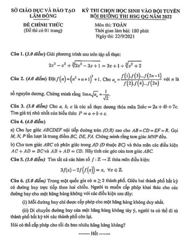 Vào ngày Thứ Tư, 22 tháng 09 năm 2021, Sở Giáo dục và Đào tạo tỉnh Lâm Đồng đã tổ chức kỳ thi chọn học sinh vào đội tuyển bồi dưỡng thi học sinh giỏi Quốc gia môn Toán năm học 2021 – 2022. Đề thi chọn đội tuyển thi HSG QG môn Toán năm 2022 do Sở GD&ĐT Lâm Đồng ra gồm 01 trang với 06 bài toán dạng tự luận, thời gian làm bài 180 phút.