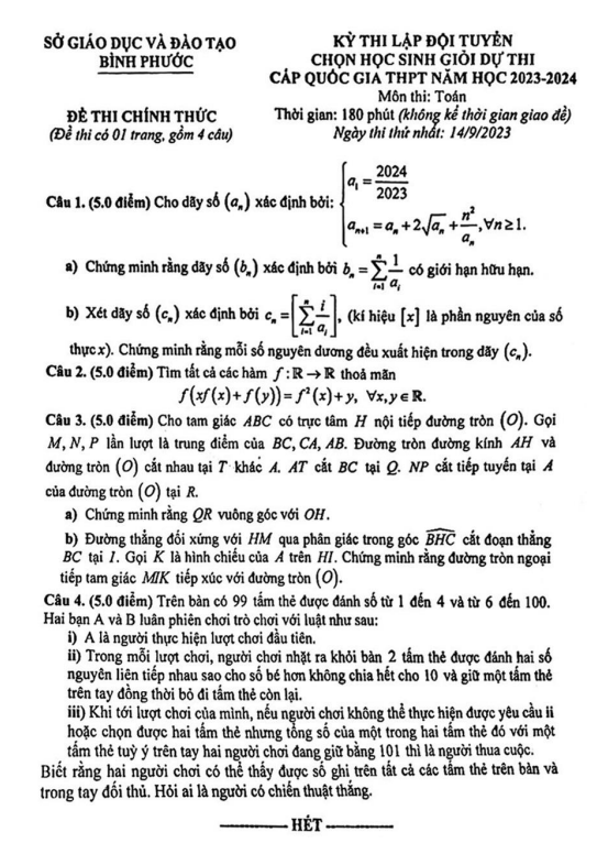 Đề chọn đội tuyển thi HSG QG môn Toán năm 2023 – 2024 sở GD&ĐT Bình Phước