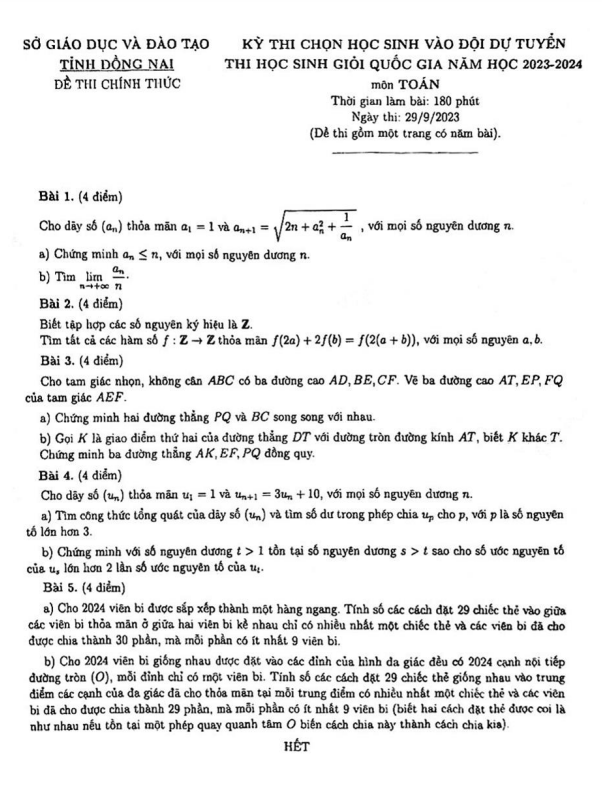Đề chọn đội tuyển thi HSG QG môn Toán năm 2023-2024 sở GD&ĐT Đồng Nai bao gồm các câu hỏi sau: