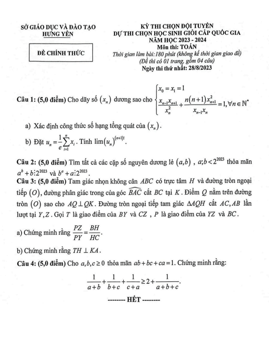 Đề chọn đội tuyển thi HSG QG môn Toán năm 2023 2024 sở GD ĐT Hưng Yên