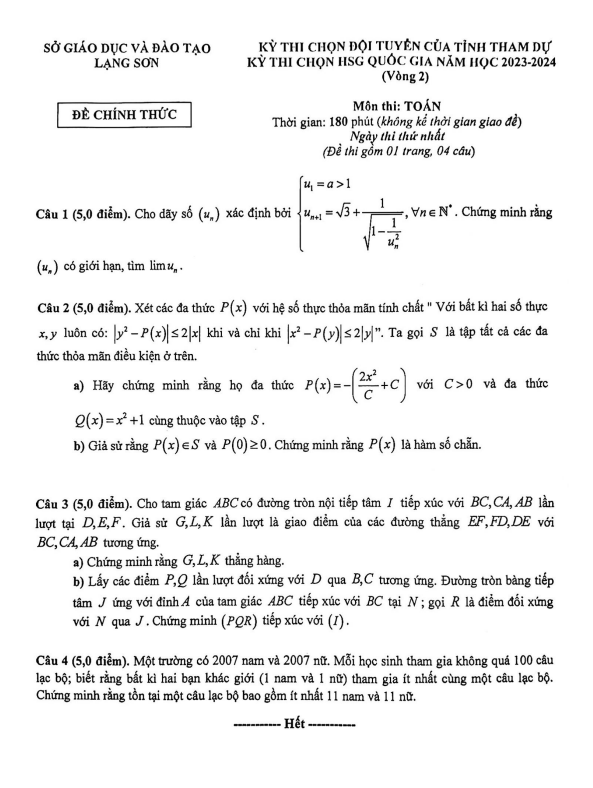Chào các thầy cô và các em học sinh, Sytu xin giới thiệu đến quý vị đề thi chọn đội tuyển của tỉnh Lạng Sơn tham dự kỳ thi chọn học sinh giỏi Quốc gia môn Toán năm học 2023 – 2024 sở Giáo dục và Đào tạo Lạng Sơn.