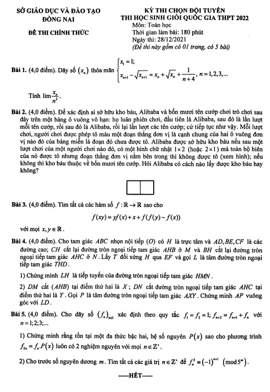 Ngày thứ Ba, 28 tháng 12 năm 2021, Sở Giáo dục và Đào tạo tỉnh Đồng Nai đã tổ chức kỳ thi chọn đội tuyển Học sinh giỏi Quốc gia THPT môn Toán cho năm học 2021-2022. Đề chọn đội tuyển thi HSG QG THPT 2022 môn Toán của sở GD&ĐT Đồng Nai bao gồm 01 trang với 05 bài toán dạng tự luận, với thời gian làm bài 180 phút (không tính thời gian phát đề).