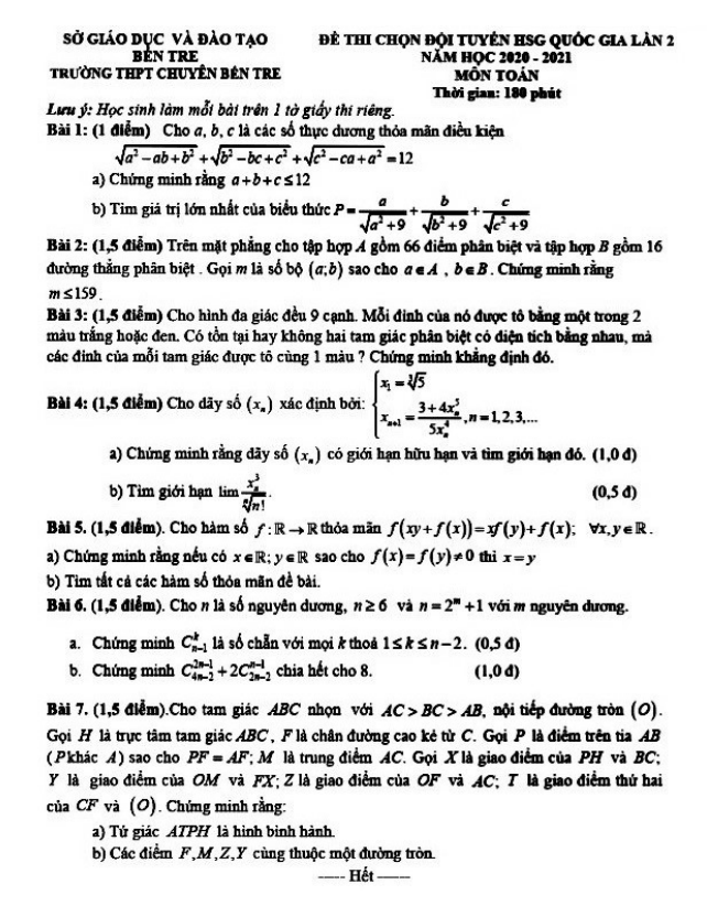 Đề chọn đội tuyển thi HSG Toán Quốc gia 2020 – 2021 trường chuyên Bến Tre (lần 2) không hề đơn giản với nhiều bài toán dạng tự luận đầy thách thức. Trên một trang giấy, học sinh phải đối mặt với 07 bài toán phức tạp và phải giải quyết chúng trong thời gian giới hạn là 180 phút, không tính thời gian phát đề.