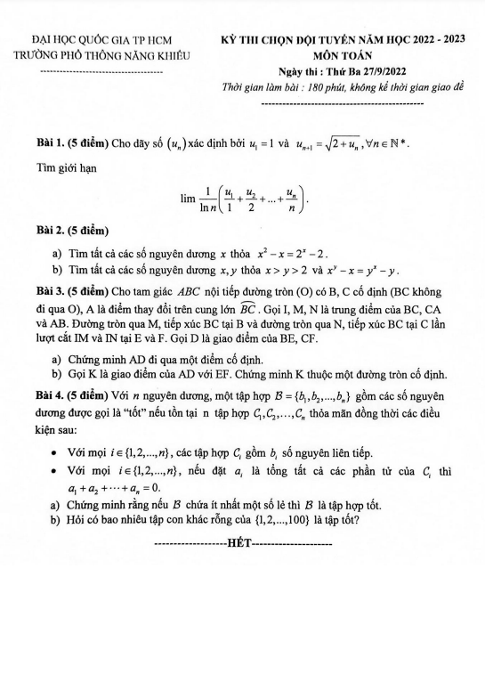 Dưới đây là một số câu hỏi trích dẫn từ Đề chọn đội tuyển Toán năm 2022-2023 trường Phổ thông Năng khiếu TP HCM: