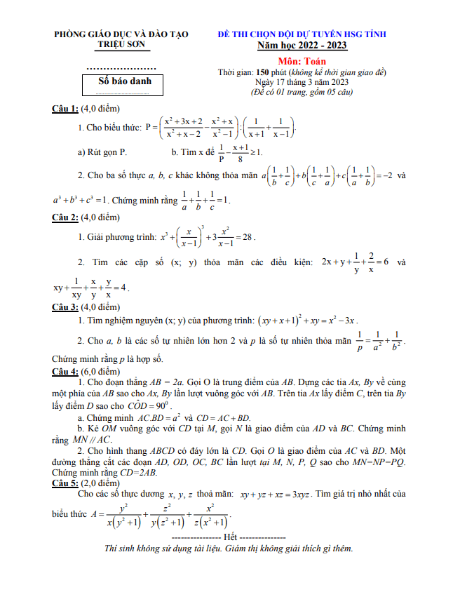 Xin chào quý thầy cô và các em học sinh lớp 8! Hôm nay, Sytu xin giới thiệu đến mọi người đề chọn đội dự tuyển học sinh giỏi cấp tỉnh môn Toán cho năm học 2022-2023 tại phòng Giáo dục và Đào tạo huyện Triệu Sơn, tỉnh Thanh Hóa. Kỳ thi sẽ diễn ra vào ngày 17 tháng 03 năm 2023, với đề thi bao gồm đáp án, lời giải chi tiết và hướng dẫn chấm điểm.