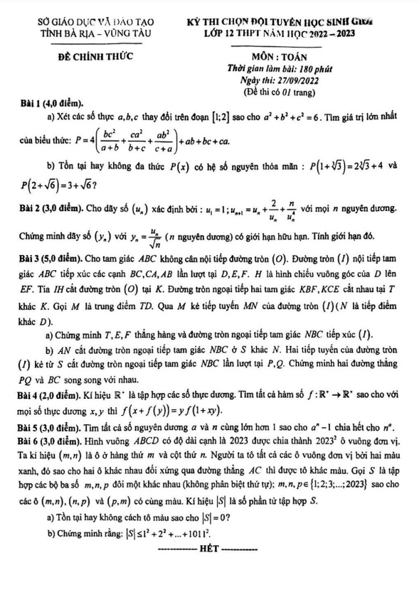 Xin chào quý thầy cô và các bạn học sinh lớp 12! Đã đến lúc chúng ta cùng khám phá bộ đề thi chọn đội tuyển học sinh giỏi môn Toán lớp 12 THPT năm học 2022 – 2023 của sở Giáo dục và Đào tạo tỉnh Bà Rịa – Vũng Tàu. Kỳ thi sẽ diễn ra vào ngày 27 tháng 09 năm 2022.