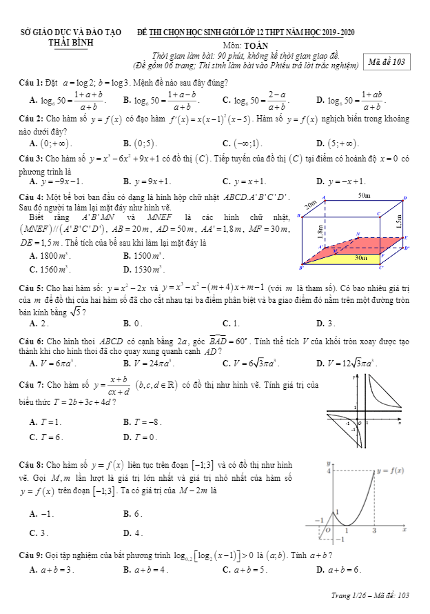 Vừa qua, sở Giáo dục và Đào tạo tỉnh Thái Bình đã tổ chức kỳ thi chọn học sinh giỏi (HSG) môn Toán lớp 12 THPT năm học 2019 – 2020. Đề chọn học sinh giỏi Toán lớp 12 THPT năm 2019 – 2020 sở GD&ĐT Thái Bình đã được biên soạn theo dạng trắc nghiệm với 4 mã đề: 103, 203, 303, 403.