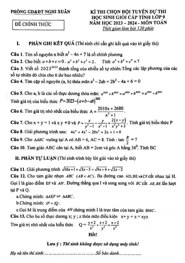 Đề chọn học sinh giỏi lớp 9 môn Toán năm 2023 2024 phòng GD ĐT Nghi Xuân Hà Tĩnh