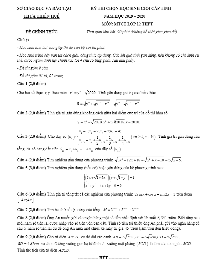 Ngày 04 tháng 10 năm 2019, Sở Giáo dục và Đào tạo Thừa Thiên Huế đã tổ chức kỳ thi chọn học sinh giỏi cấp tỉnh giải toán trên máy tính cầm tay cho học sinh khối 12 trong năm học 2019 – 2020. Kỳ thi bao gồm 09 câu hỏi, thời gian làm bài 90 phút, thí sinh phải trình bày cách giải một cách vắn tắt và chỉ rõ công thức áp dụng.