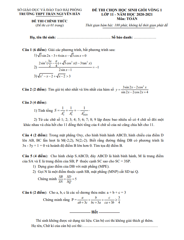 Đề chọn HSG Toán lớp 11 vòng 1 năm 2020 – 2021 trường THPT Trần Nguyên Hãn – Hải Phòng