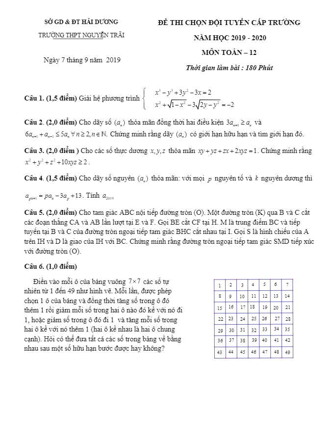Ngày 07 tháng 09 năm 2019, trường THPT chuyên Nguyễn Trãi, tỉnh Hải Dương đã tổ chức kỳ thi chọn đội tuyển học sinh giỏi môn Toán lớp 12 cấp trường năm học 2019 – 2020. Đề chọn HSG Toán lớp 12 cấp trường năm 2019 – 2020 THPT chuyên Nguyễn Trãi Hải Dương bao gồm 6 bài toán tự luận trên 01 trang đề thi, thời gian làm bài 180 phút. Đề thi có đáp án và lời giải chi tiết.