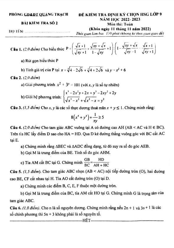Đề chọn HSG lớp 9 môn Toán năm 2022-2023 phòng GD&ĐT Quảng Trạch Quảng Bình