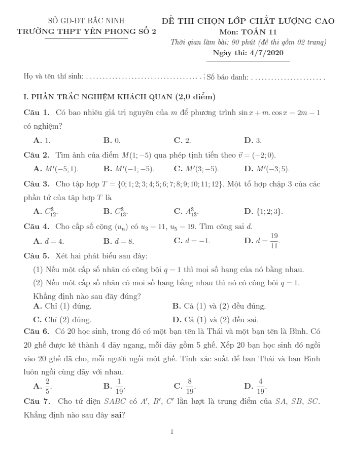 Đề chọn lớp chất lượng cao Toán 11 năm 2020 2021 trường Yên Phong 2 Bắc Ninh