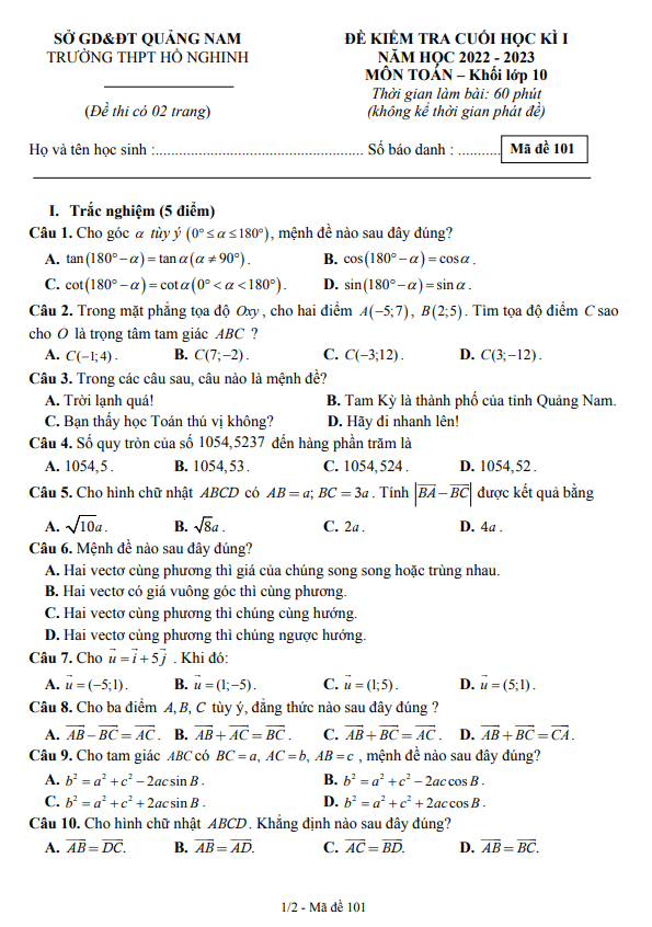 Sytu xin gửi đến quý thầy cô và các em học sinh lớp 10 thông tin về đề kiểm tra đánh giá cuối học kì 1 môn Toán năm học 2022 – 2023 tại trường THPT Hồ Nghinh, tỉnh Quảng Nam. Đề thi được thiết kế theo cấu trúc 50% trắc nghiệm và 50% tự luận, với 15 câu trắc nghiệm và 4 câu tự luận. Thời gian làm bài là 60 phút, không tính thời gian phát đề. Đề thi có đáp án và lời giải chi tiết mã đề từ 101 đến 108.Một trong những câu hỏi trong đề thi là về việc bạn Hoa thu xếp thời gian để làm thiệp trưng bày cho dịp cắm trại sắp tới. Với loại thiệp hình tam giác cần 2 giờ để hoàn thành và loại thiệp hình chữ nhật chỉ cần 1 giờ, học sinh cần lập hệ bất phương trình để biểu diễn số lượng thiệp mỗi loại mà bạn Hoa sẽ làm.Đề thi cũng đưa ra các câu hỏi về mệnh đề trong tiếng Việt và giải các bài toán khó hơn về hình thang vuông và phân tích vectơ. Bằng việc luyện tập và ôn tập trước kỳ thi, các em học sinh sẽ có cơ hội củng cố kiến thức và nâng cao kỹ năng giải quyết vấn đề toán học.Mời quý thầy cô và các em học sinh tham gia kỳ thi này để kiểm tra kiến thức và chuẩn bị tốt nhất cho kỳ thi cuối học kì 1. Chúc các em thành công!