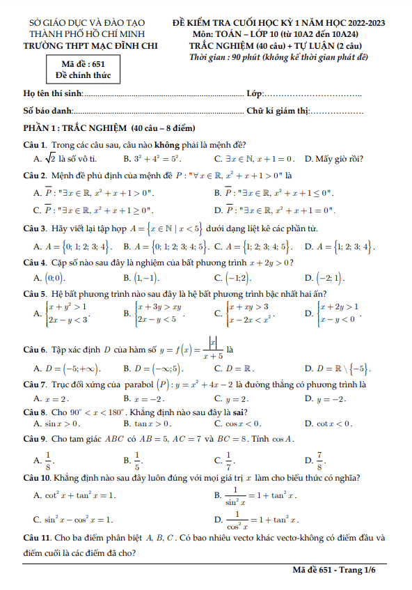 Đề cuối học kỳ 1 Toán lớp 10 năm 2022 – 2023 trường THPT Mạc Đĩnh Chi – TP HCM