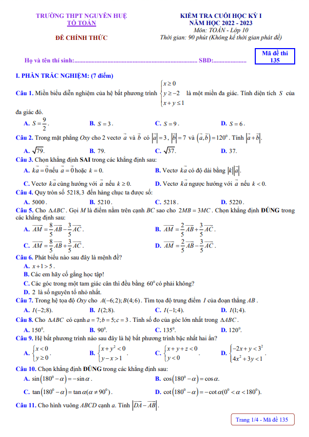 Sytu xin gửi đến các thầy cô và các em học sinh lớp 10 đề kiểm tra cuối học kỳ 1 môn Toán 2022 – 2023 trường THPT Nguyễn Huệ, tỉnh Thừa Thiên Huế. Đề thi mã đề 135 gồm 35 câu trắc nghiệm (70% số điểm) + 04 câu tự luận (30% số điểm), thời gian làm bài 90 phút.