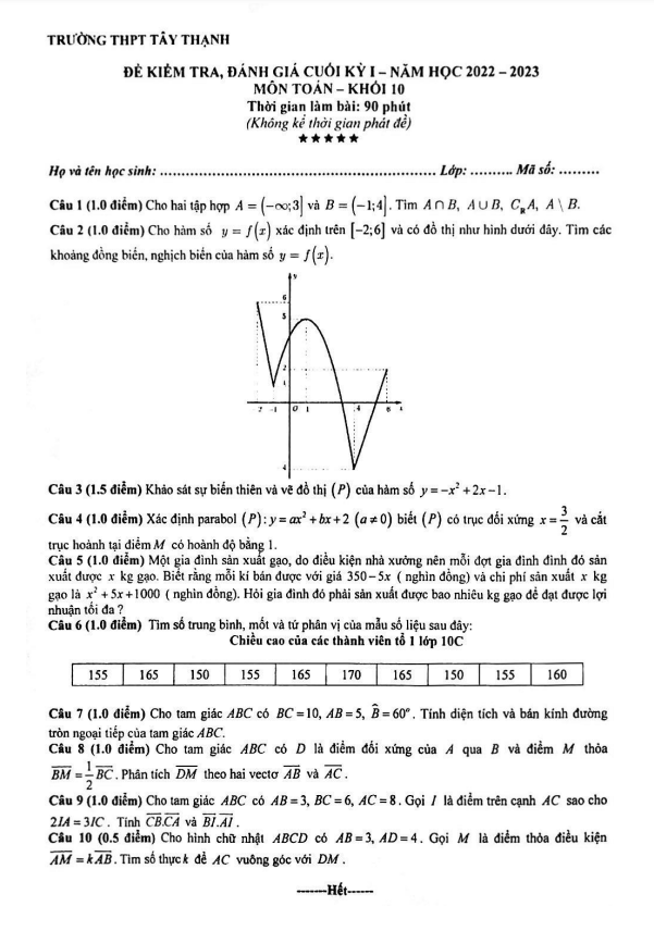 Đề cuối kỳ 1 Toán lớp 10 năm học 2022 – 2023 trường THPT Tây Thạnh – TP HCM