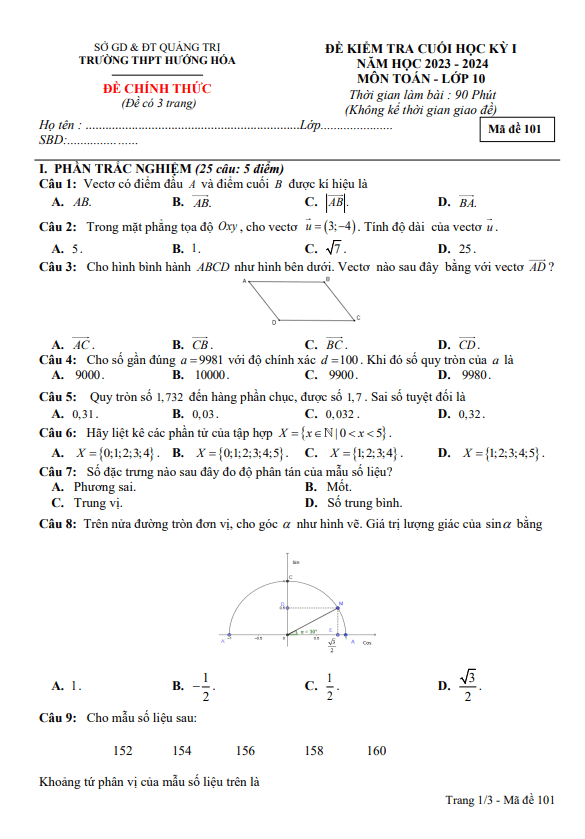 Đề cuối học kỳ 1 Toán lớp 10 năm học 2023 – 2024 trường THPT Hướng Hóa